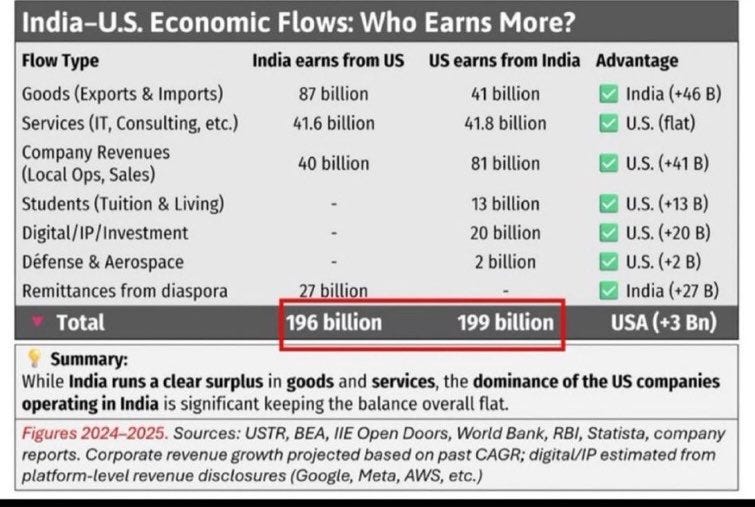 Behind the geopolitical manoeuvring lies an equally revealing economic story. For years, successive U.S. administrations have framed India as a beneficiary of American openness, highlighting the large Indian goods surplus in bilateral trade. Indeed, India exports far more merchandise to the United States than it imports, fueling the perception that Washington is on the losing end of the relationship. Yet when the entire balance of flows is considered, a more complex picture emerges, one in which the United States actually runs an overall surplus. According to 2024–25 data, India earns about $196 billion from the United States while the United States earns roughly $199 billion from India. This $3 billion surplus in Washington’s favour is not only real but also strategically significant, for it reveals where the structural advantages lie. India’s goods trade surplus amounts to $46 billion, but the United States makes up for this through dominance in services, digital/IP, education, defence, and corporate revenues. American companies earn $81 billion in India, double what Indian firms make in the U.S., demonstrating the extent of U.S. corporate penetration of Indian markets.